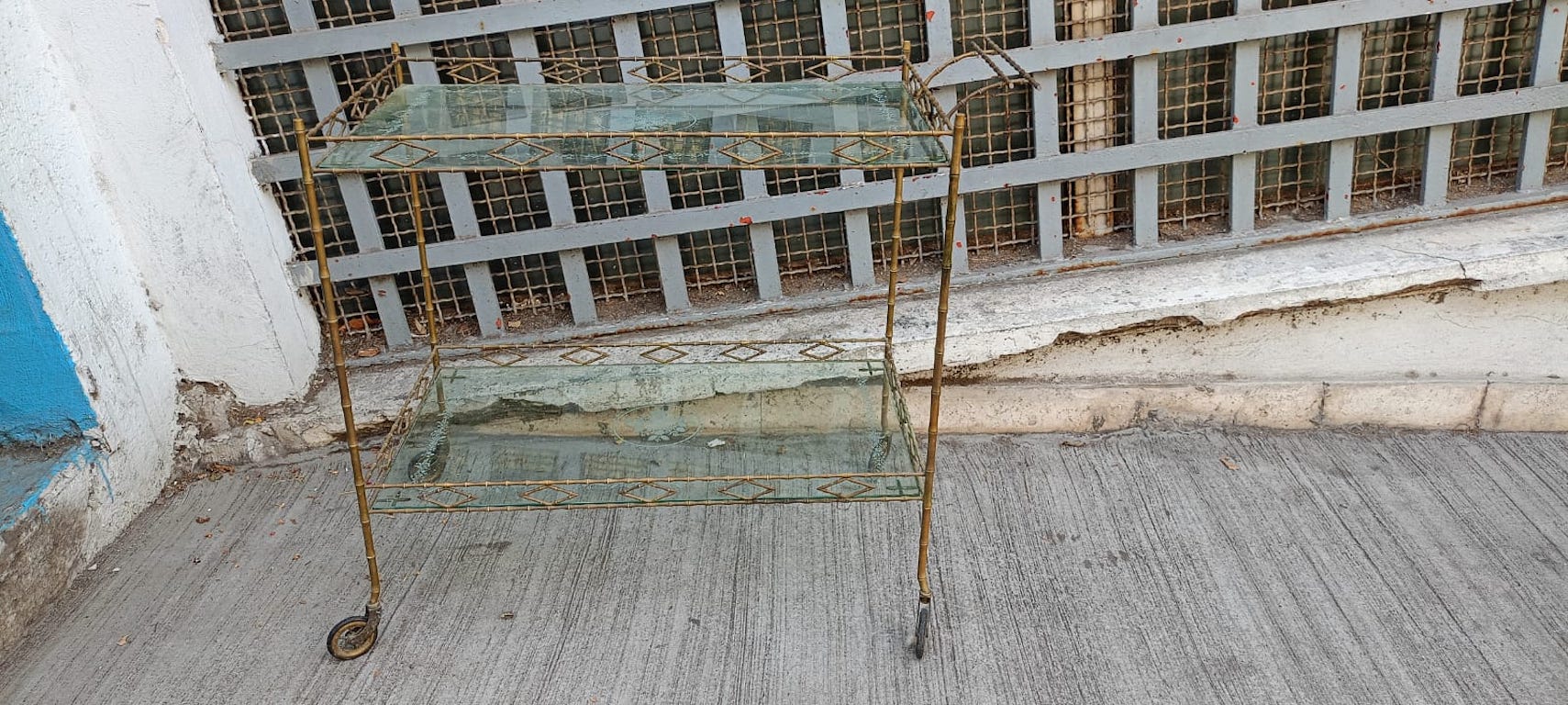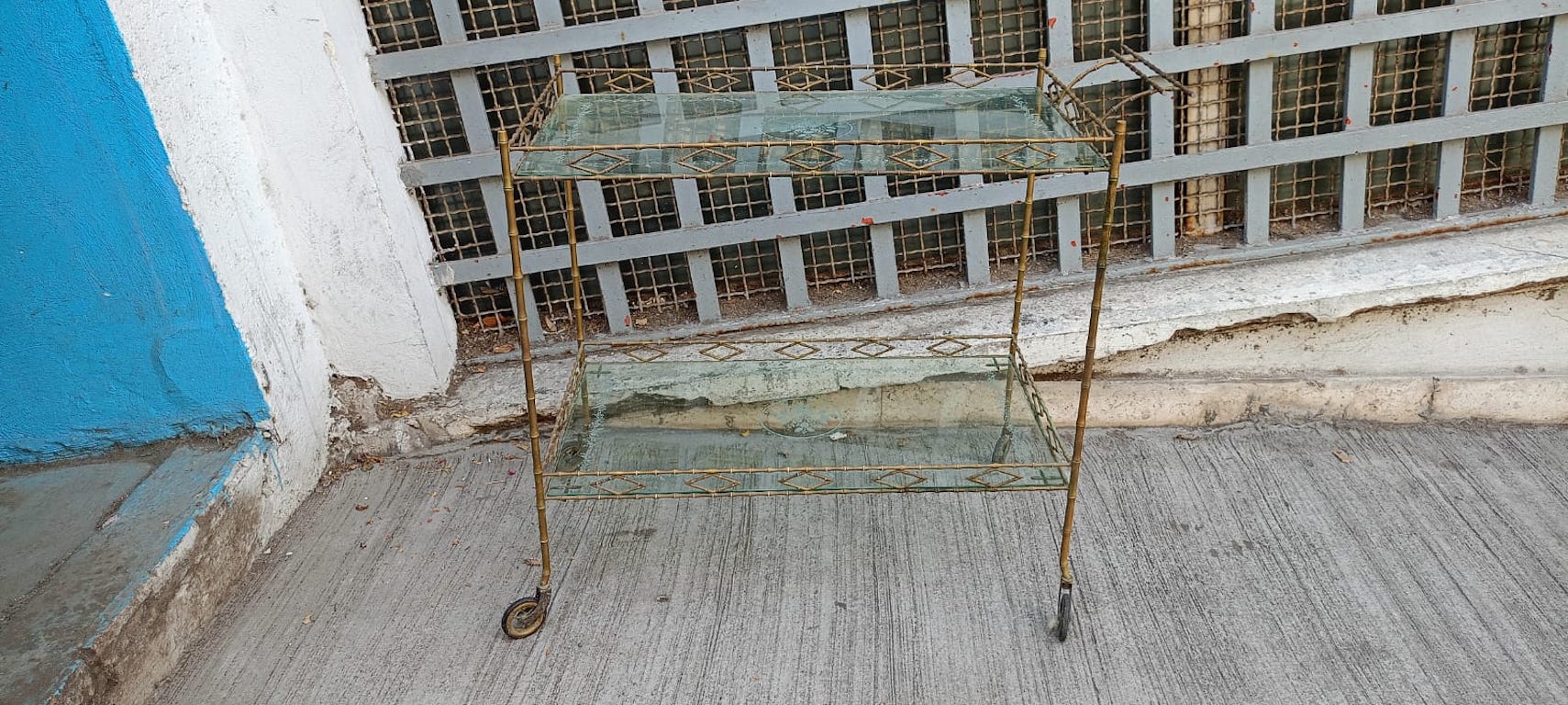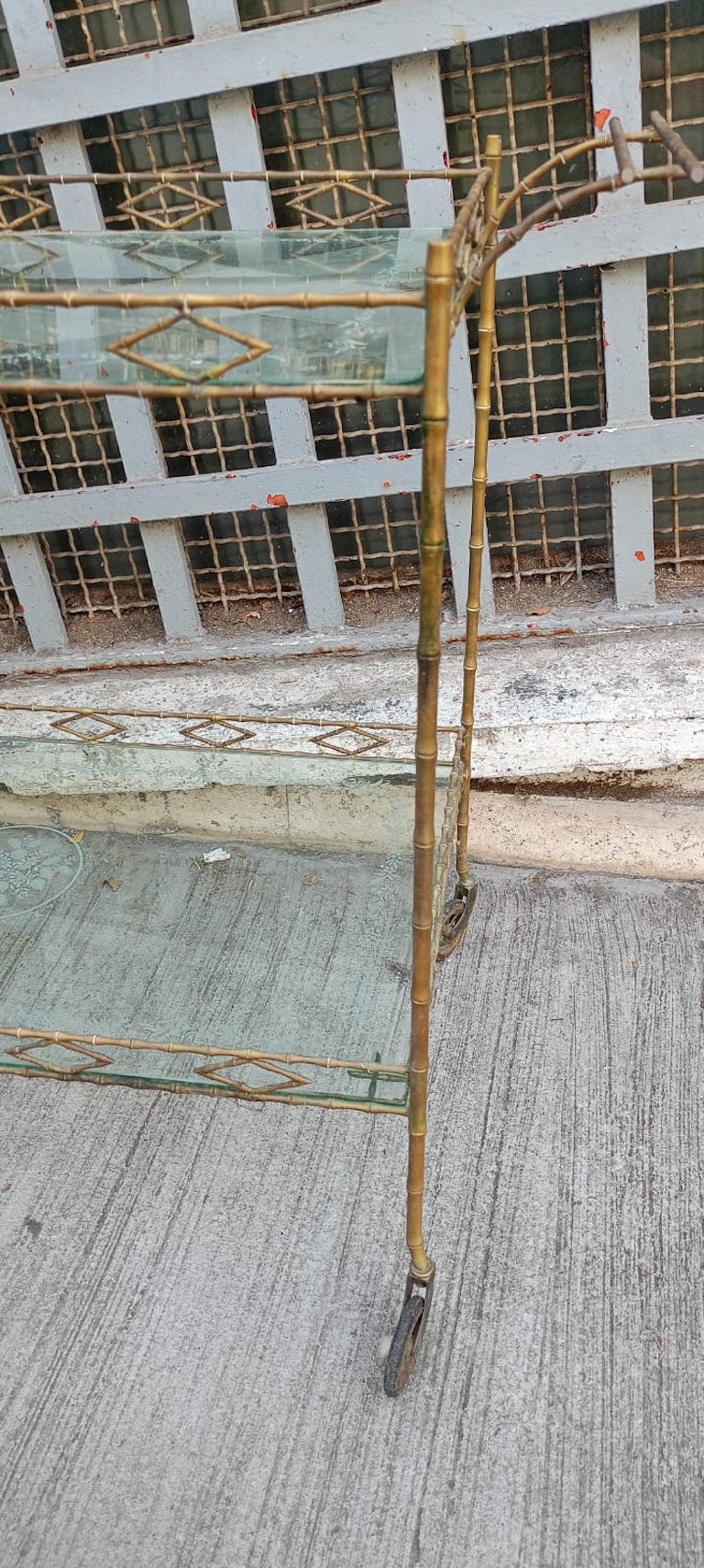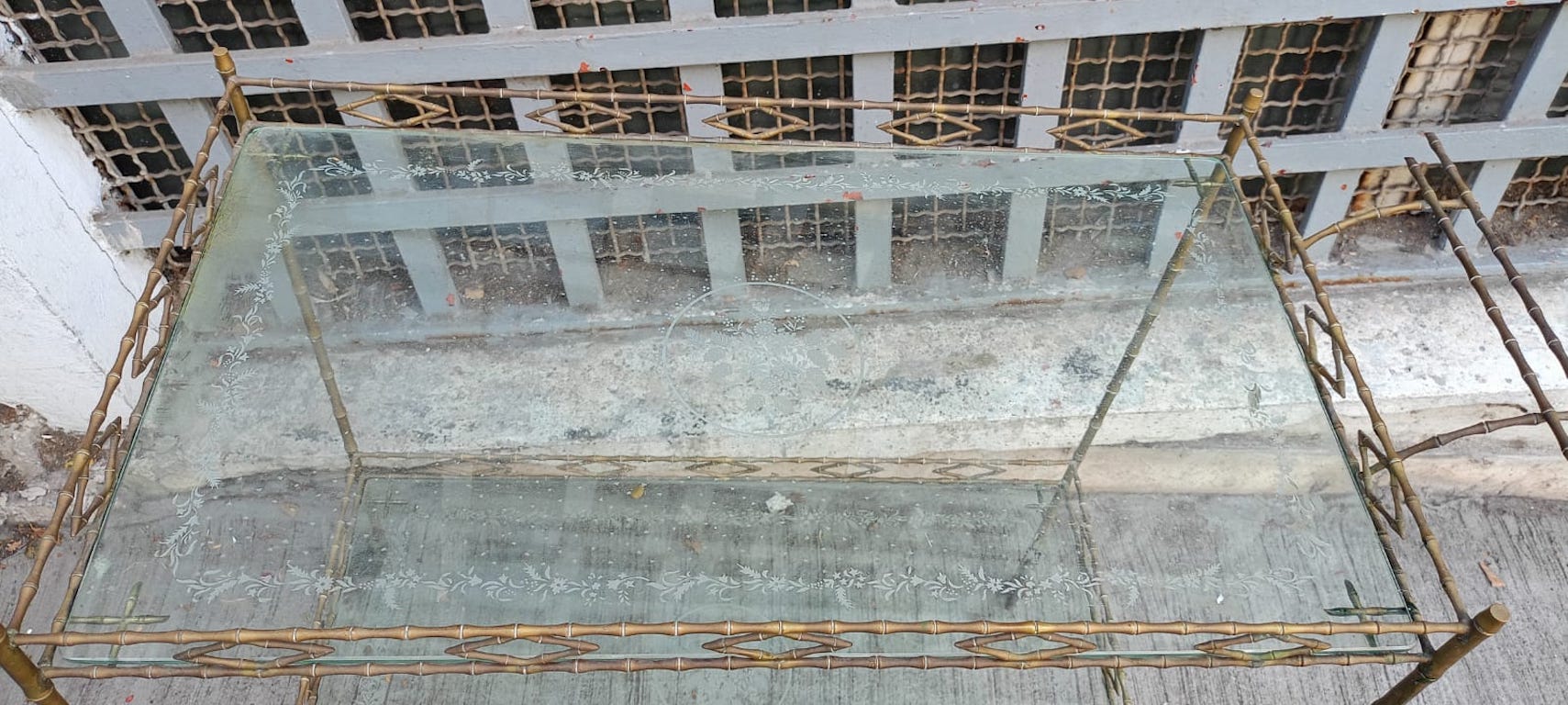 Maison Baguès, brass-plated trolley, and glass with bamboo decor, circa 1950-1960. The trays are engraved glass with flowers and leafs decor. W-80cm. H-67cm. D-41cm.