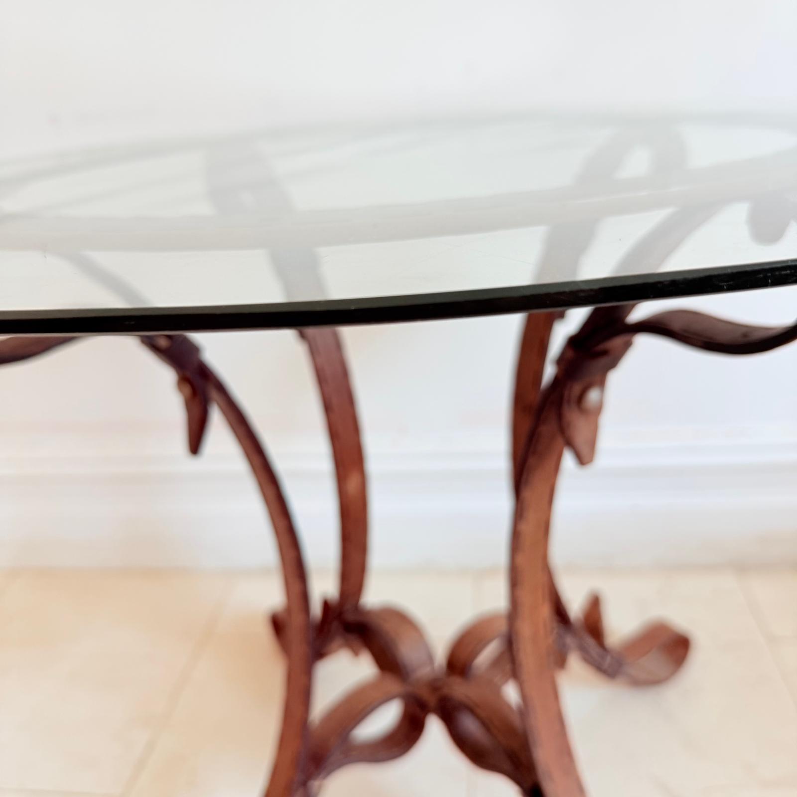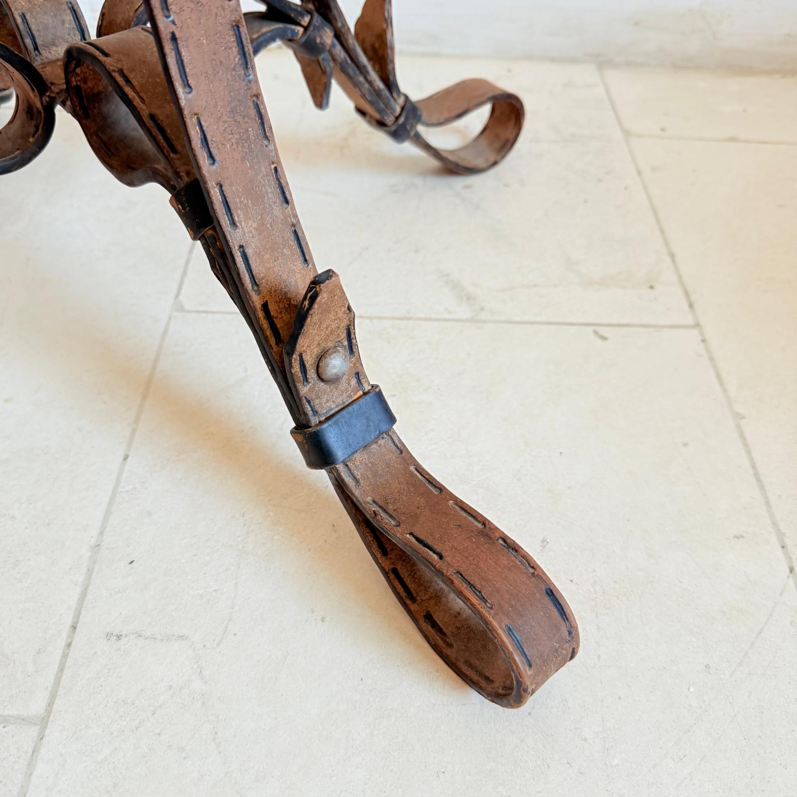An elegant circular coffee table in metal with copper patinated finish, base created as though it were made of leather harness straps and buckles. Reminiscent of Hermes designs, this will be striking in a tailored setting. D-69cm. H-54cm. c.70’s French