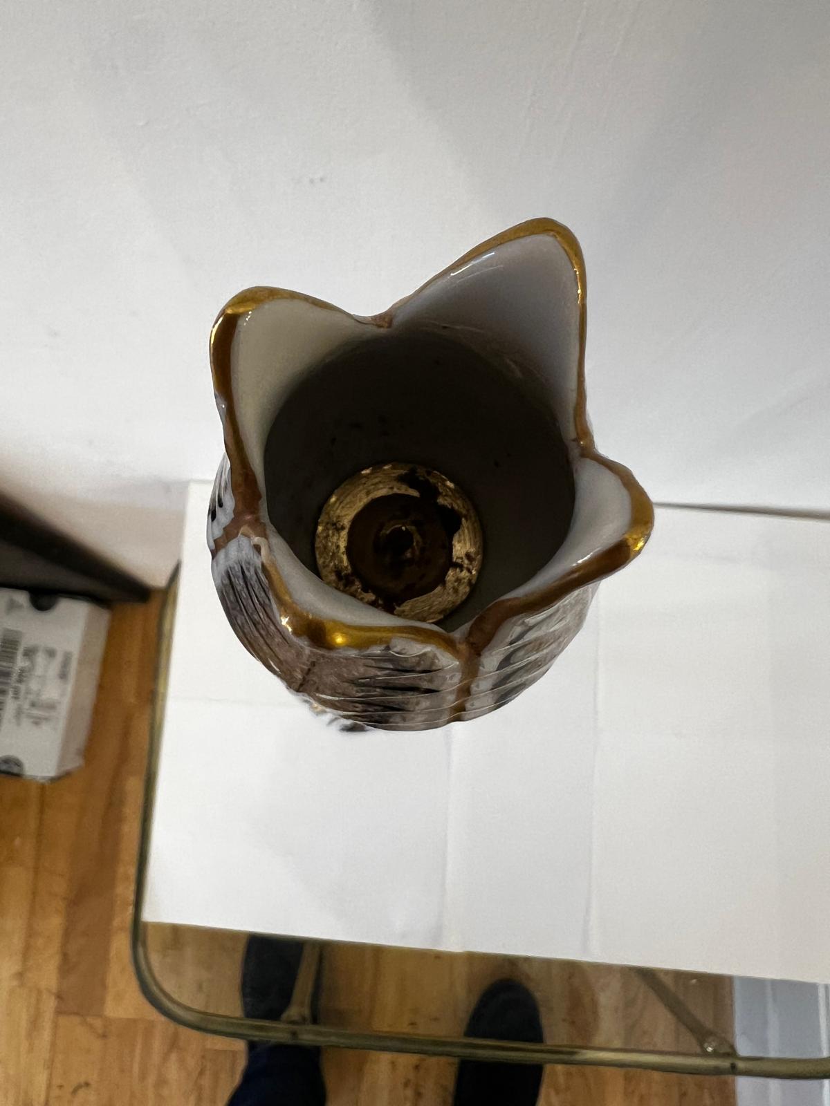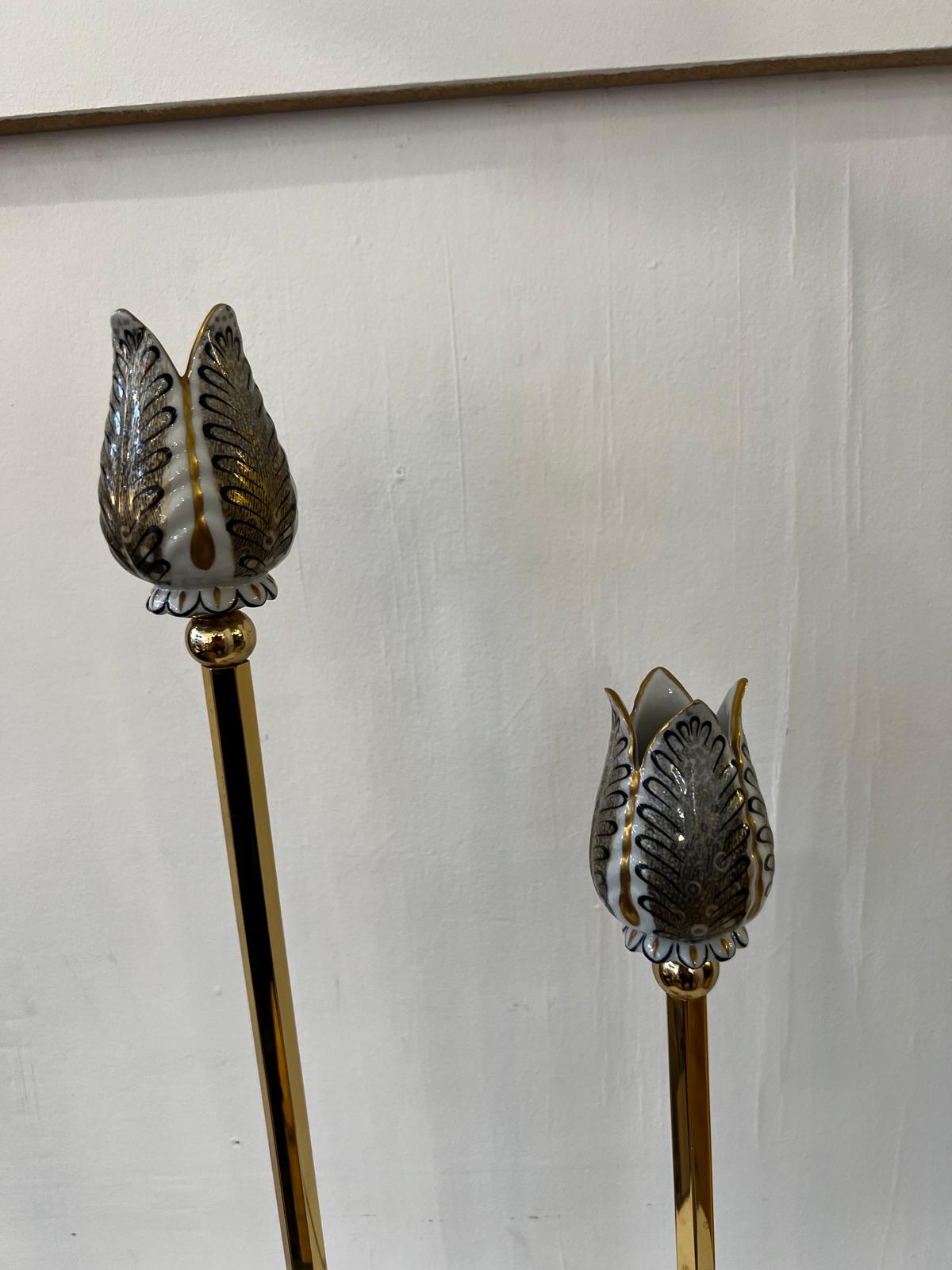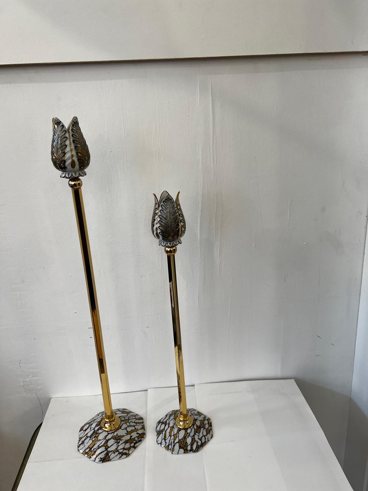The grand scale a porcelain, a pair of candlesticks made of gilt and glazed porcelain on the brass stem in the shape of the tulip, signed and monogram on the base, largest is: 54cm. tall and 12cm in diameter 21.4in. x 4.5in.